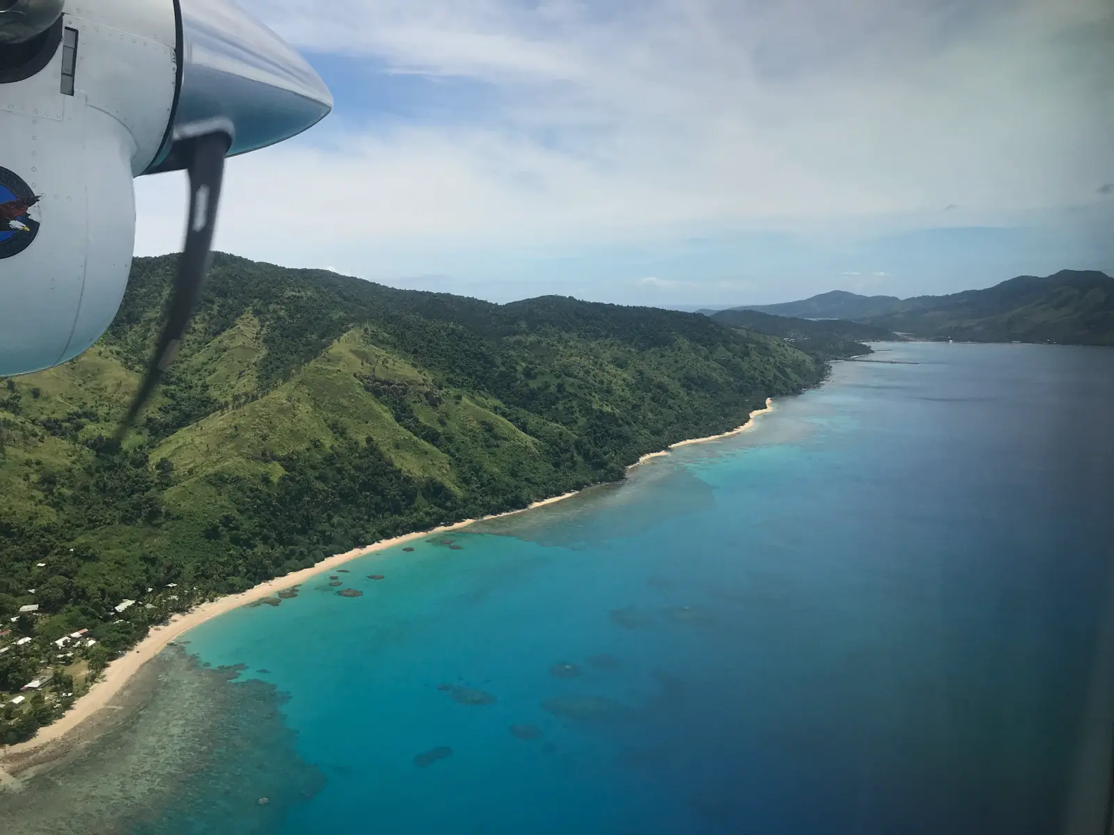 Aerial view of property on Galoa Island at low tide. Blue roof structure is our home and lodge, currently under construction.